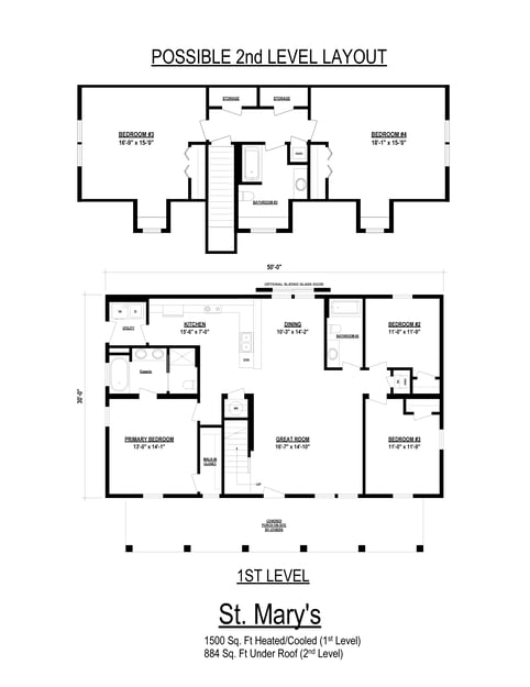 The St. Mary’s is a 3 bedroom 2 bath home with 1,500 square feet of living space and unfinished space in the attic for you or your builder to finish as desired. If you choose to finish the upper area on site, this will add an additional 884 square feet of space.