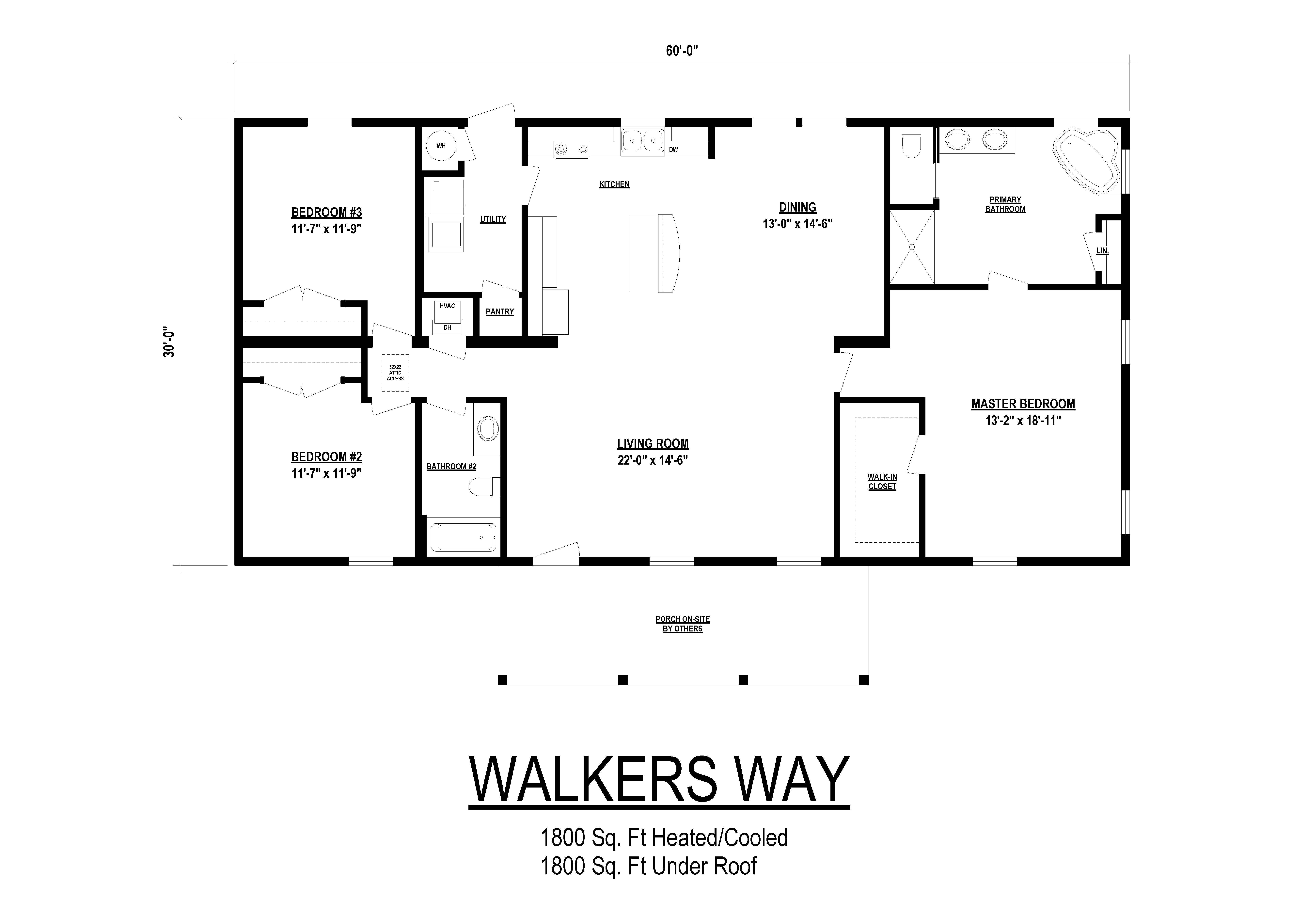The Walkers Way floor plan provides 1,800 square feet of heated/cooled space, with a total of 1,800 square feet of under roof space.